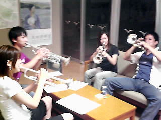 トランペットパートだけ外に出て合わして来いや。 と言われて練習中のトランペッターの方々。 結構頑張ってたようデス。 |